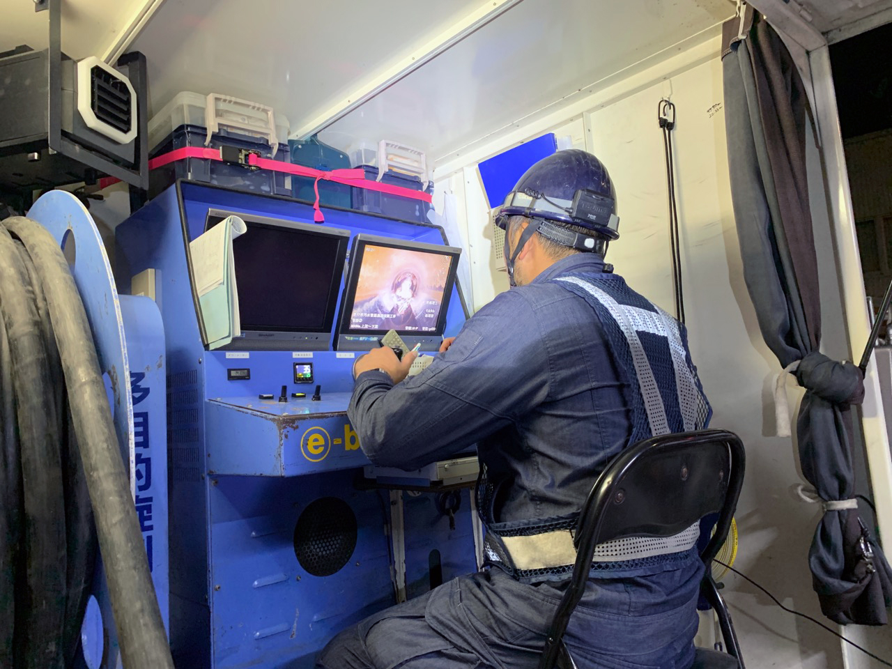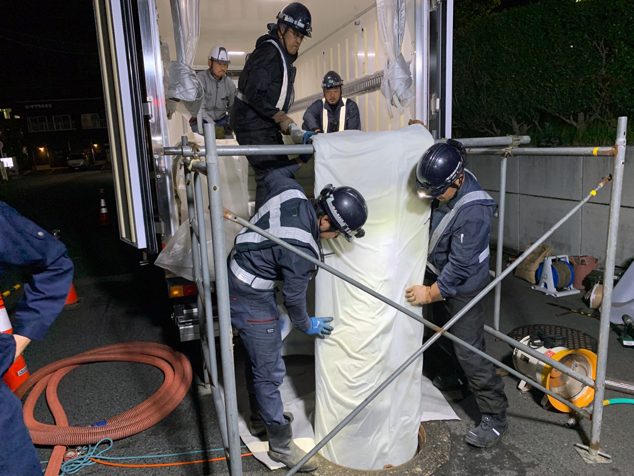 「管更生」という工法で、道路を掘り返すことなく、老朽化した下水管を内側から補強します。
