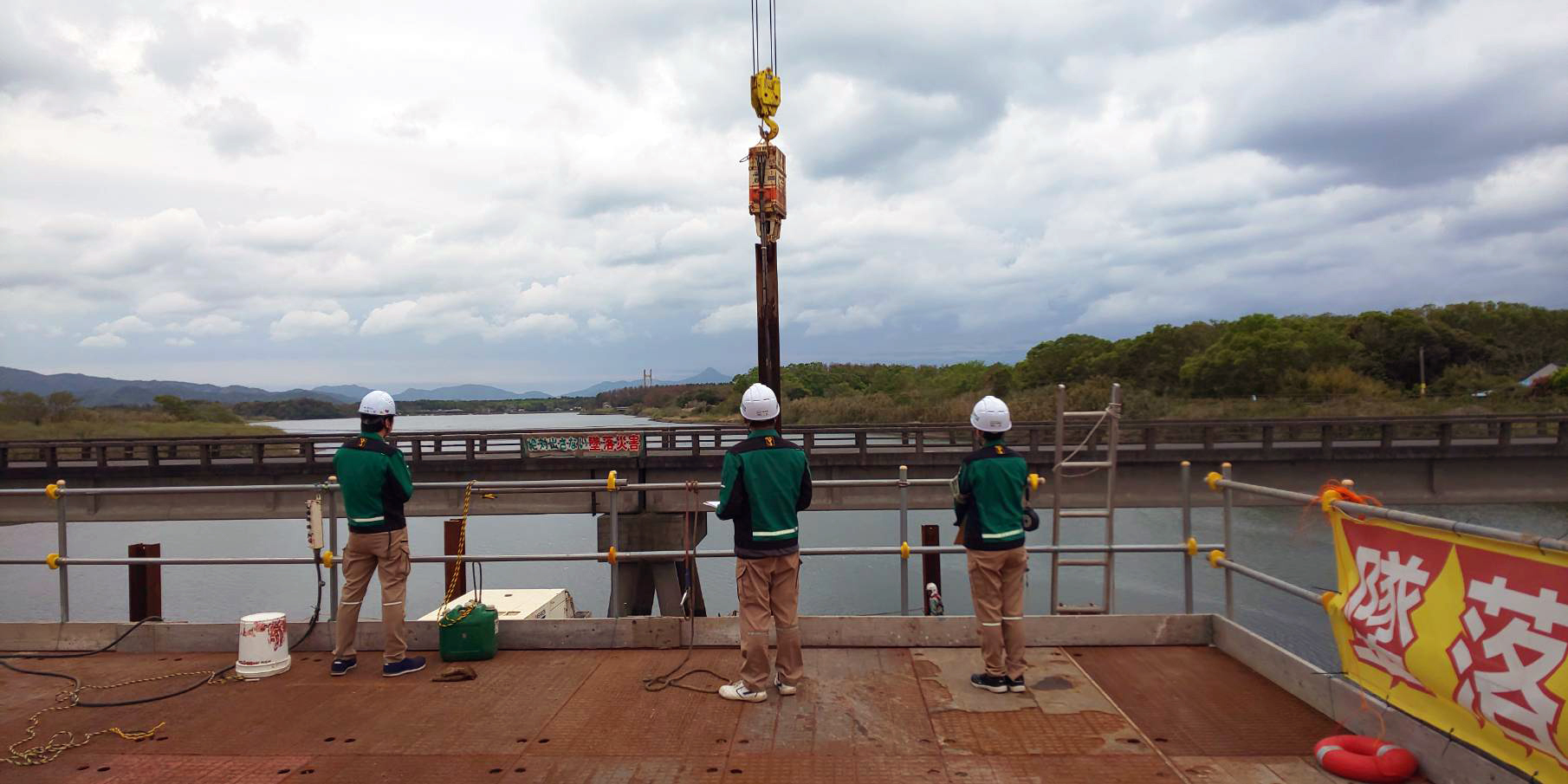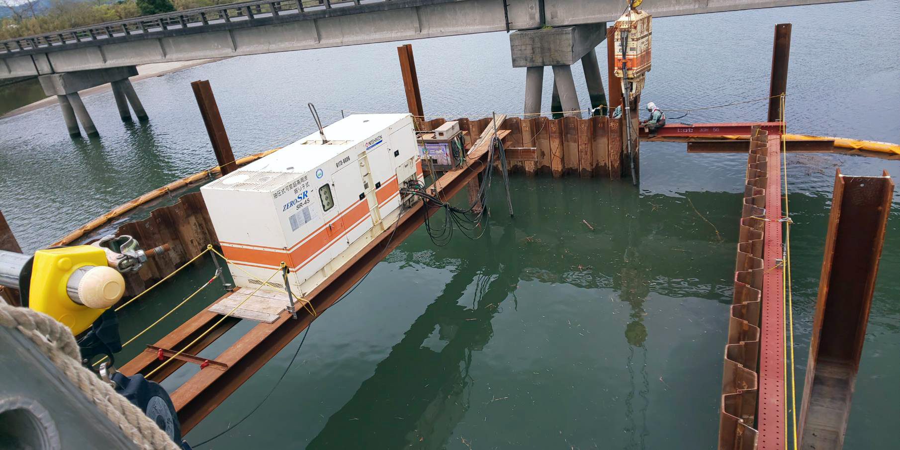 三つ目の橋脚予定地を鋼矢板で囲み、水を閉め切ろうとしています。