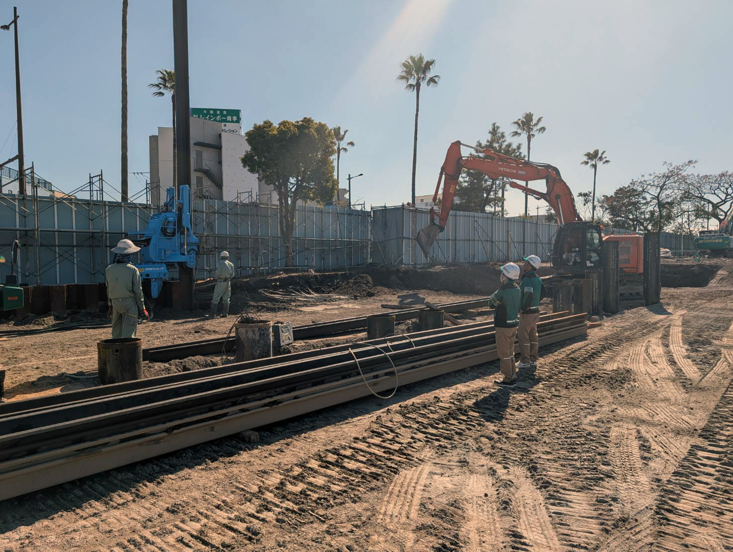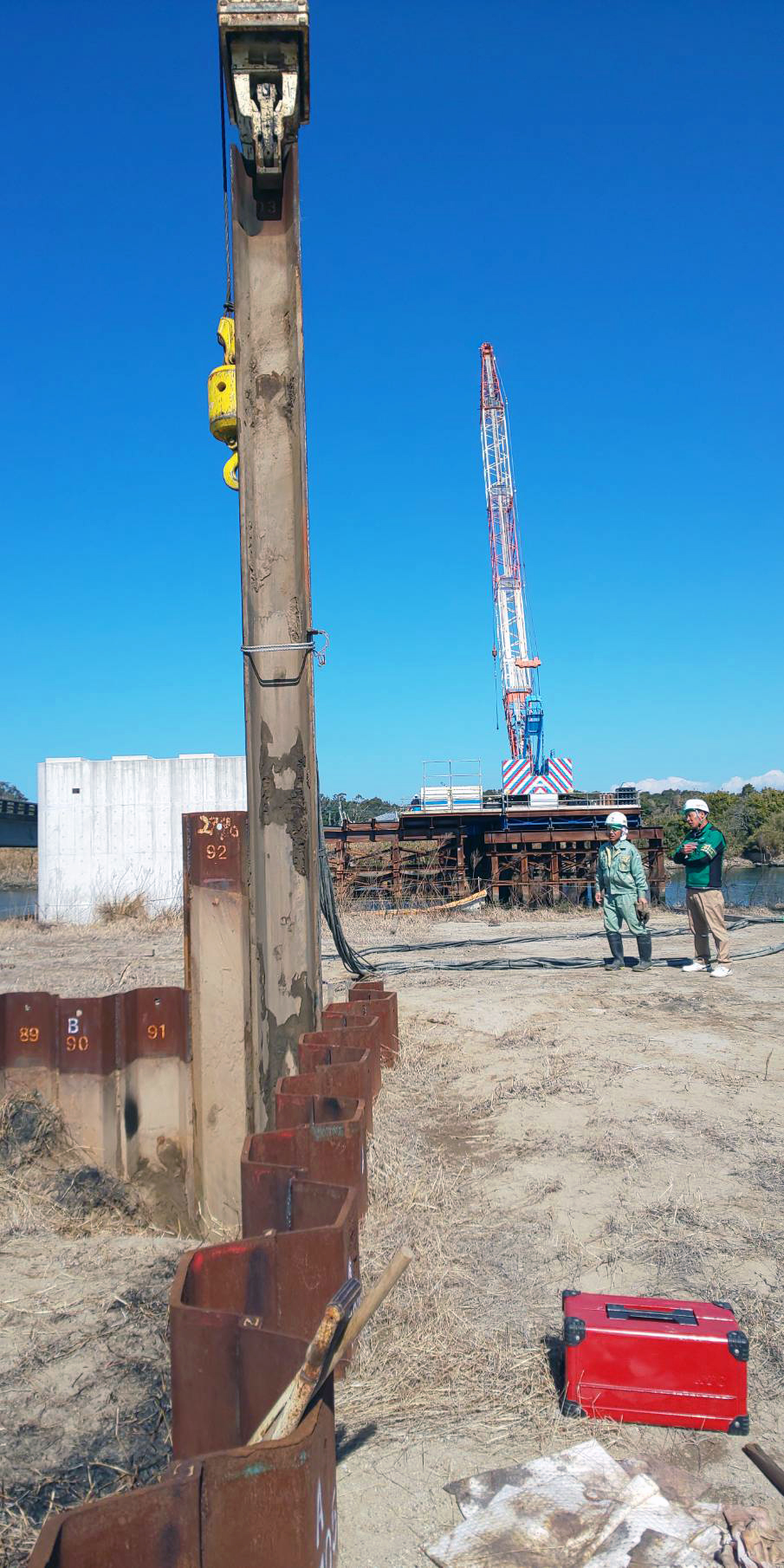 この現場では、鋼矢板同士を溶接で接合し、とても長い鋼矢板にして使用しました。